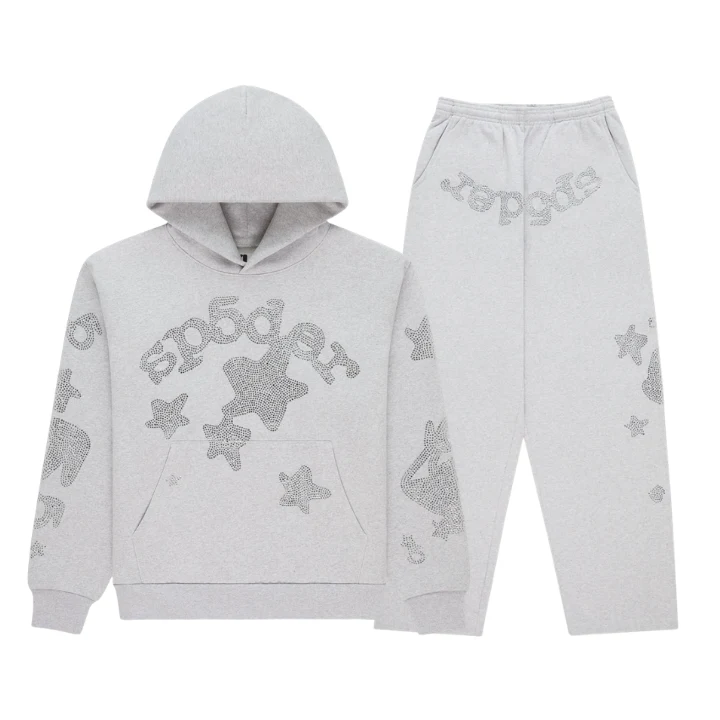 Sp5der / Shop Best Sp5der Hoodies / Sp5der Rhinestone Beluga Heather Grey Tracksuit
