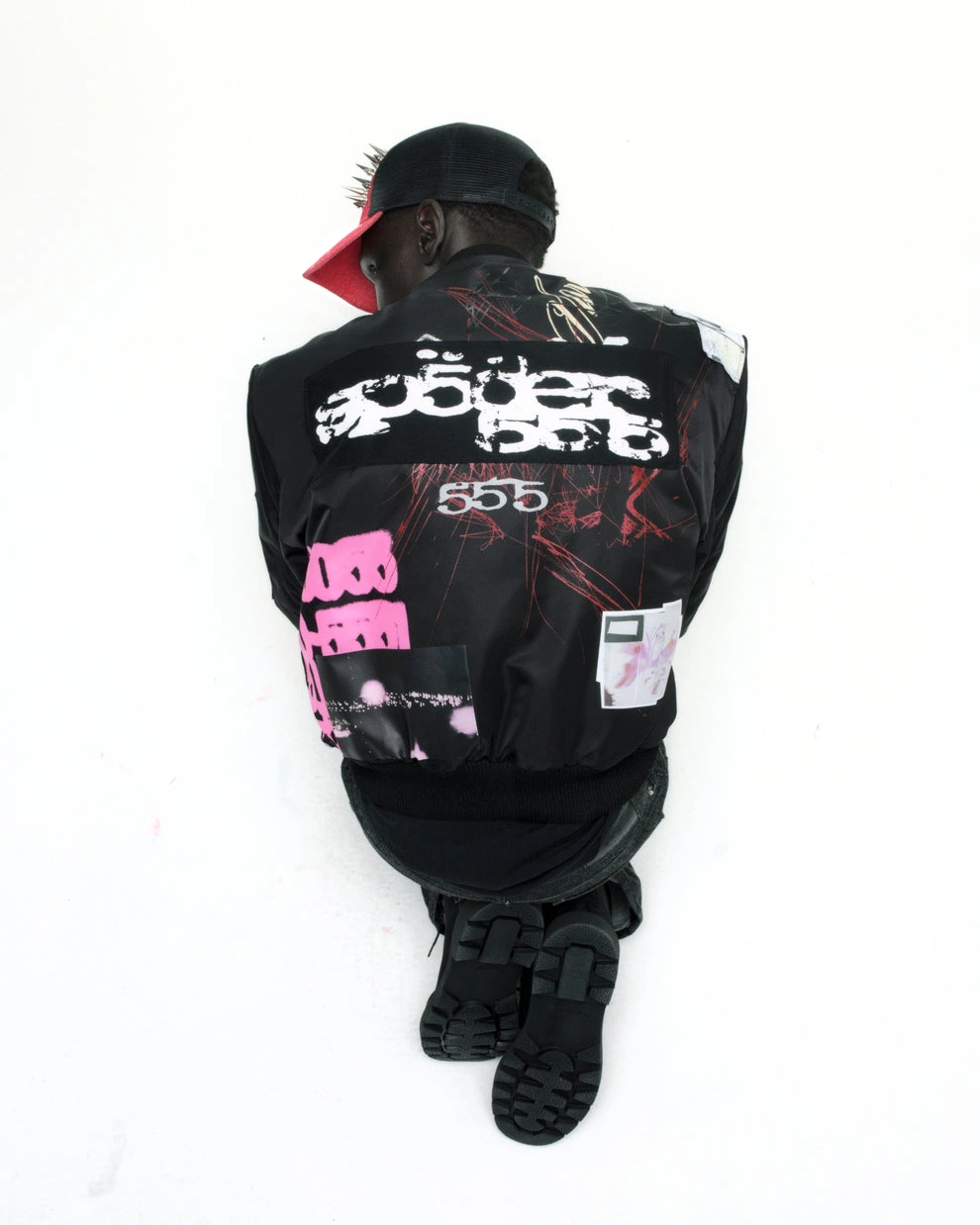 Custom SP5DER patches and graphic print throughout front and back.