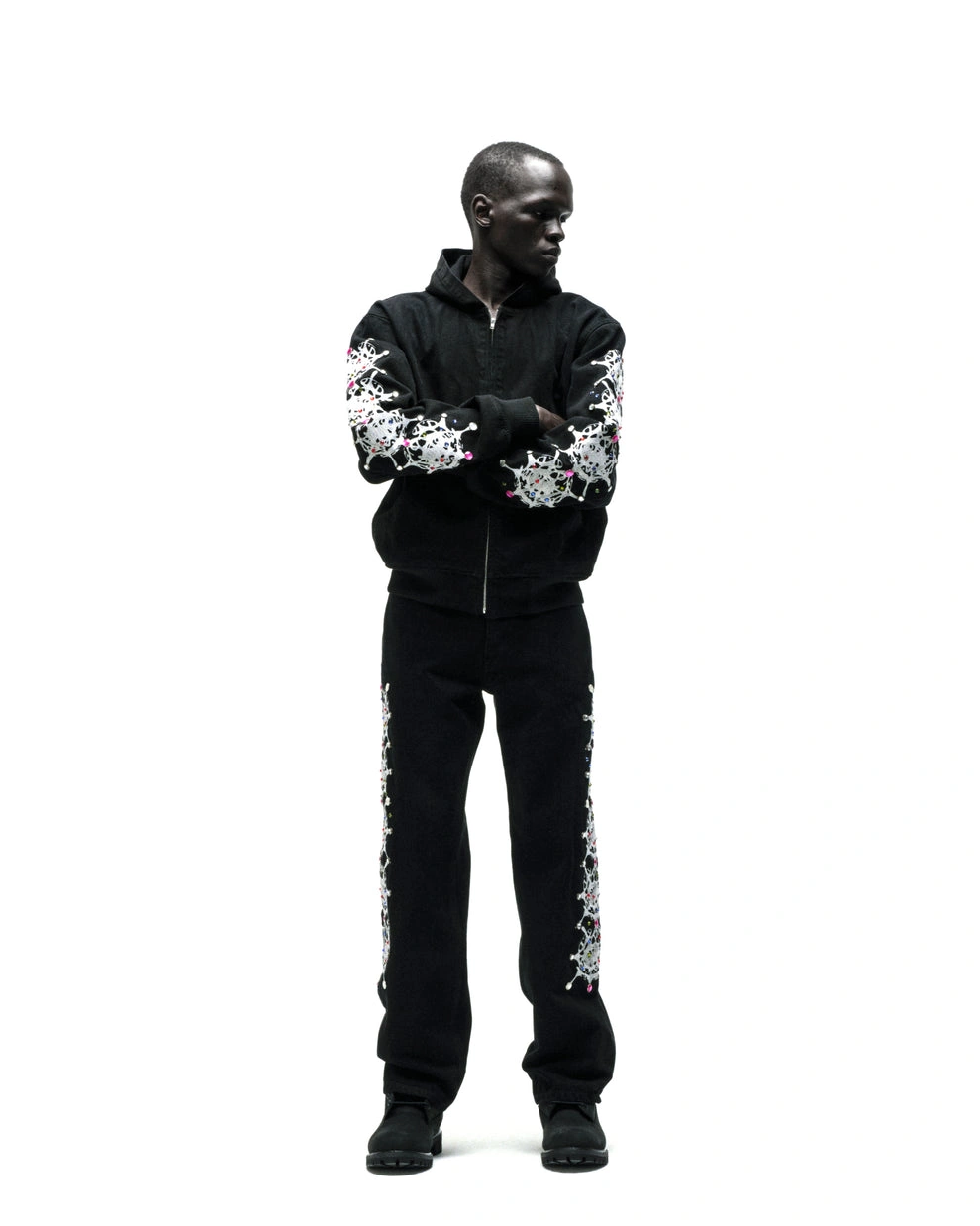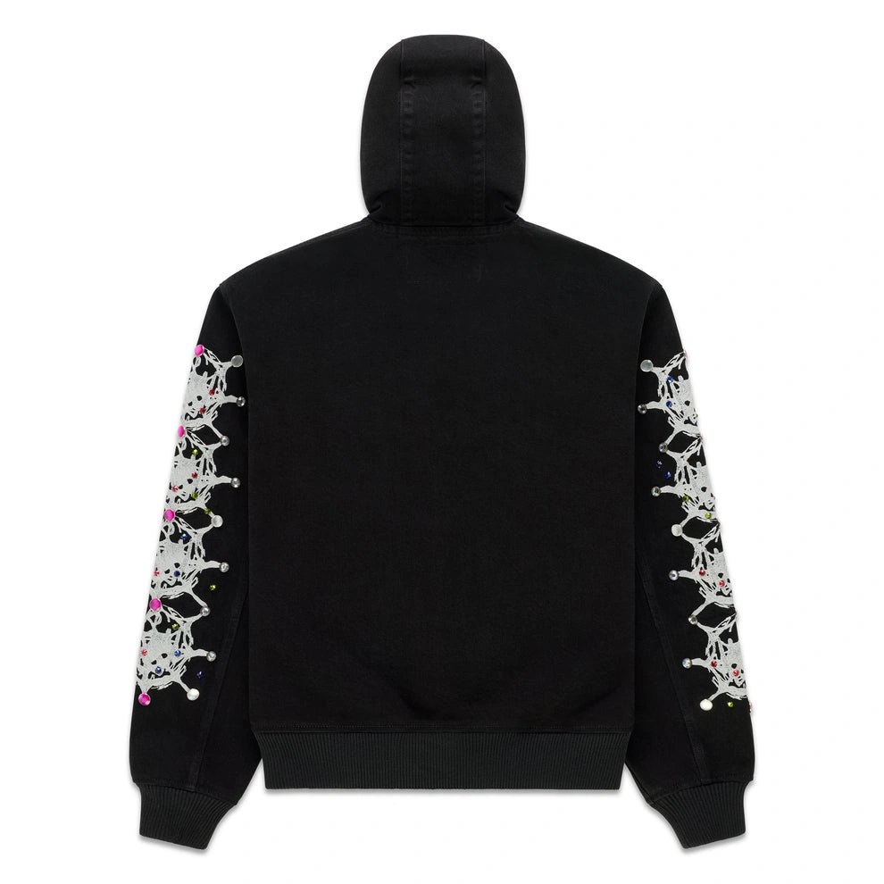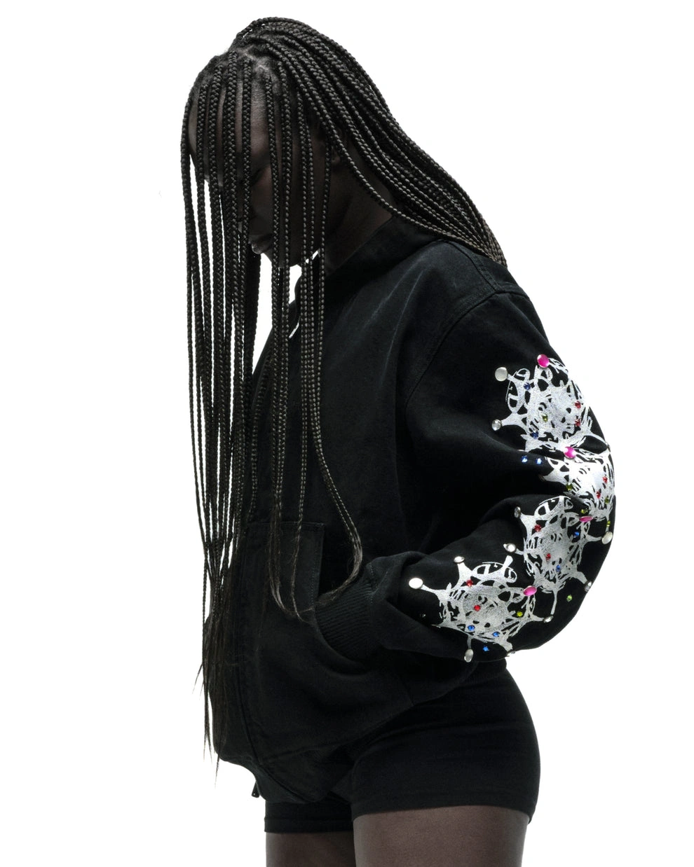 Web print design and rhinestone embellishments on sleeves.