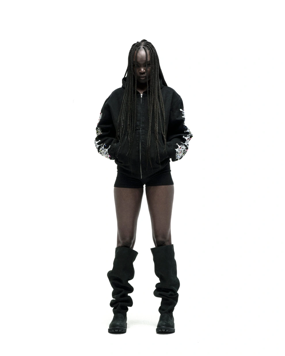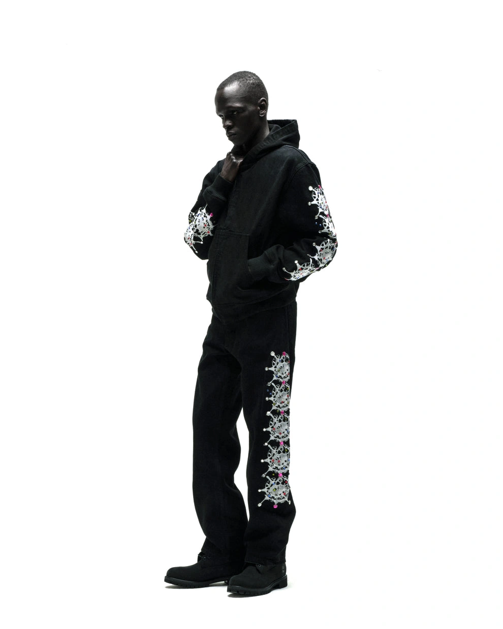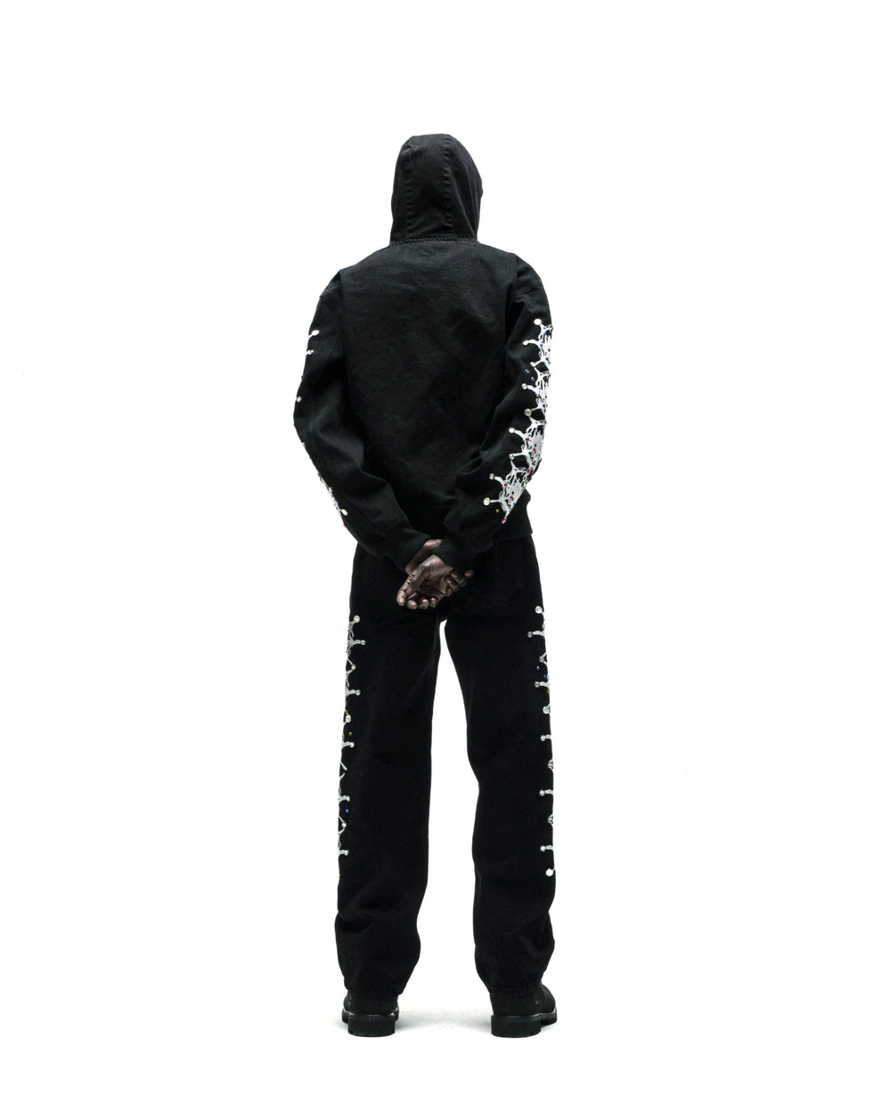 Web print design and rhinestone embellishments on sleeves.
