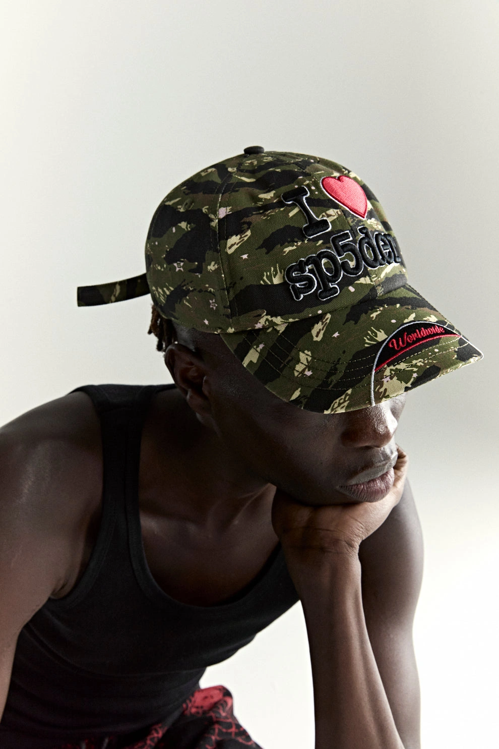 Curved brim and ‘Worldwide’ detail.